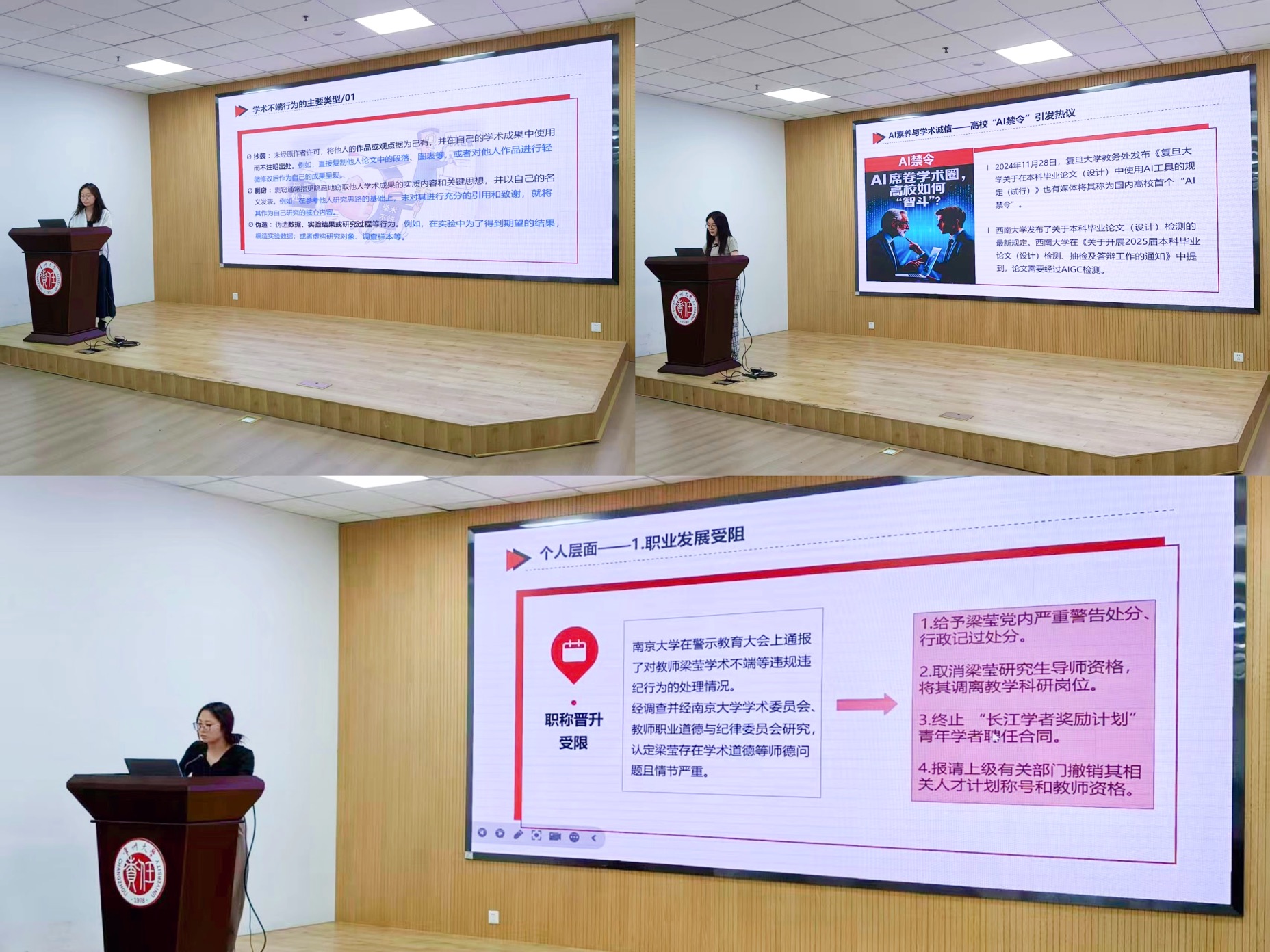 活動中,李欣庭根據(jù)《高等學(xué)校預(yù)防與處理學(xué)術(shù)不端行為辦法》,介紹了抄襲、數(shù)據(jù)造假、文獻(xiàn)篡改等七種類型的學(xué)術(shù)不端行為及其界定標(biāo)準(zhǔn);韓明楊結(jié)合近年來通報(bào)的學(xué)術(shù)不端典型案例,揭示學(xué)術(shù)不端對個(gè)人、學(xué)術(shù)共同體及社會信任的嚴(yán)重危害;唐一航聚焦AI技術(shù)浪潮,深入探討其應(yīng)用帶來的學(xué)術(shù)誠信新挑戰(zhàn),并分享數(shù)字化時(shí)代堅(jiān)守學(xué)術(shù)底線的實(shí)踐路徑。