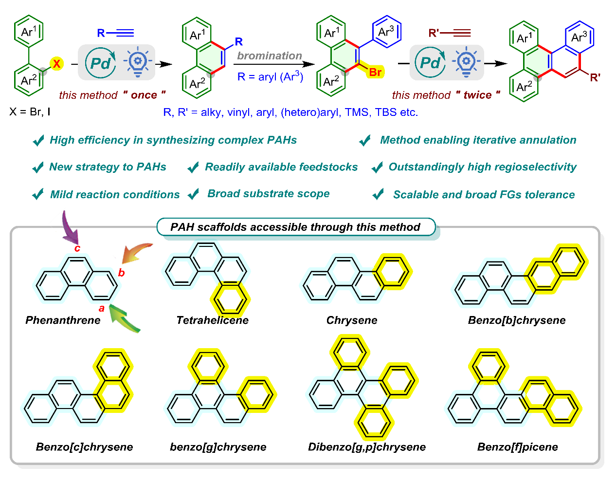 本研究由陳銘教授指導(dǎo),常州大學(xué)2023級(jí)碩士研究生周琛和2022級(jí)碩士研究生李培商為共同一作。相關(guān)成果以“Modular Synthesis of PAHs from Aryl Halides and Terminal Alkynes via Photoinduced Palladium Catalysis.”為題,發(fā)表在國(guó)際化學(xué)領(lǐng)域頂級(jí)期刊Nature Communication (NC)。
