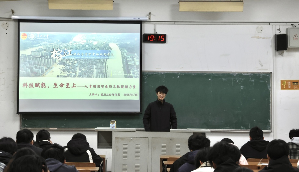 為幫助同學們更直觀地了解科技如何重塑應急救援體系、守護生命安全,11月18日晚,學生第二黨支部黨員能化233班許偉晨在W1205教室開展了“青年講師團”系列講座的第三講——“貴州洪災,見證科技力量”。