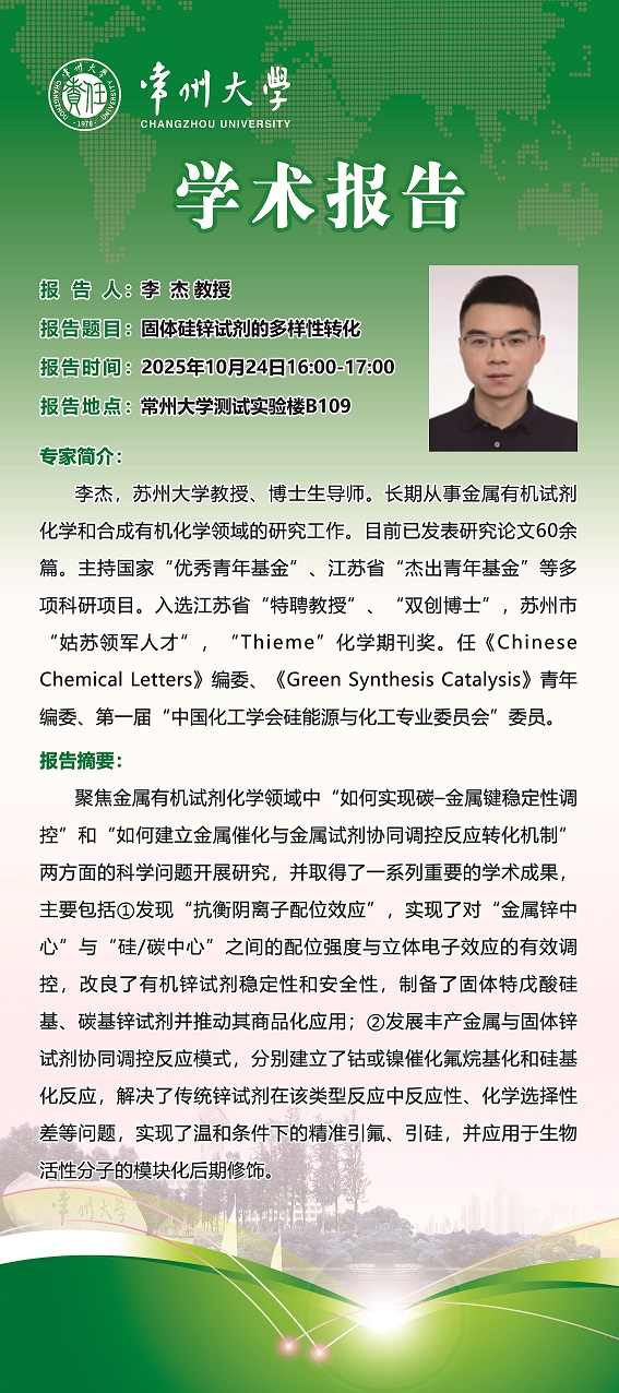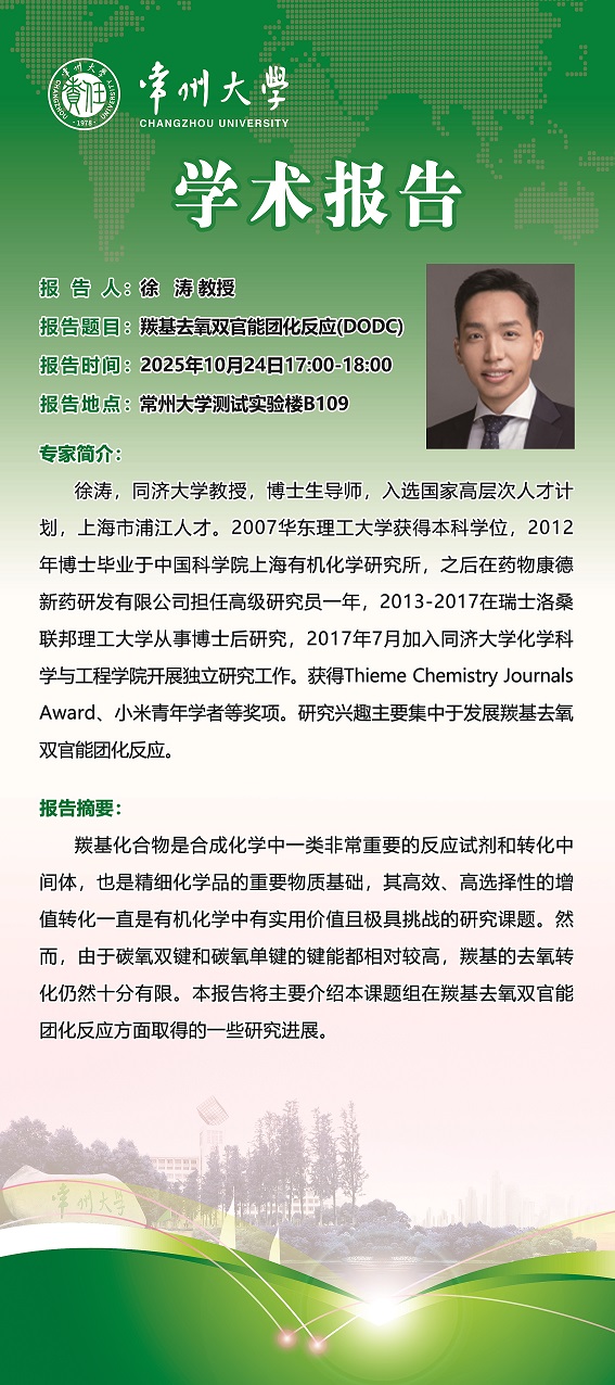 | 【學術(shù)報告】10月24日功能雜環(huán)研究院學術(shù)報告——李杰教授 蘇州大學 徐濤教授 同濟大學 |