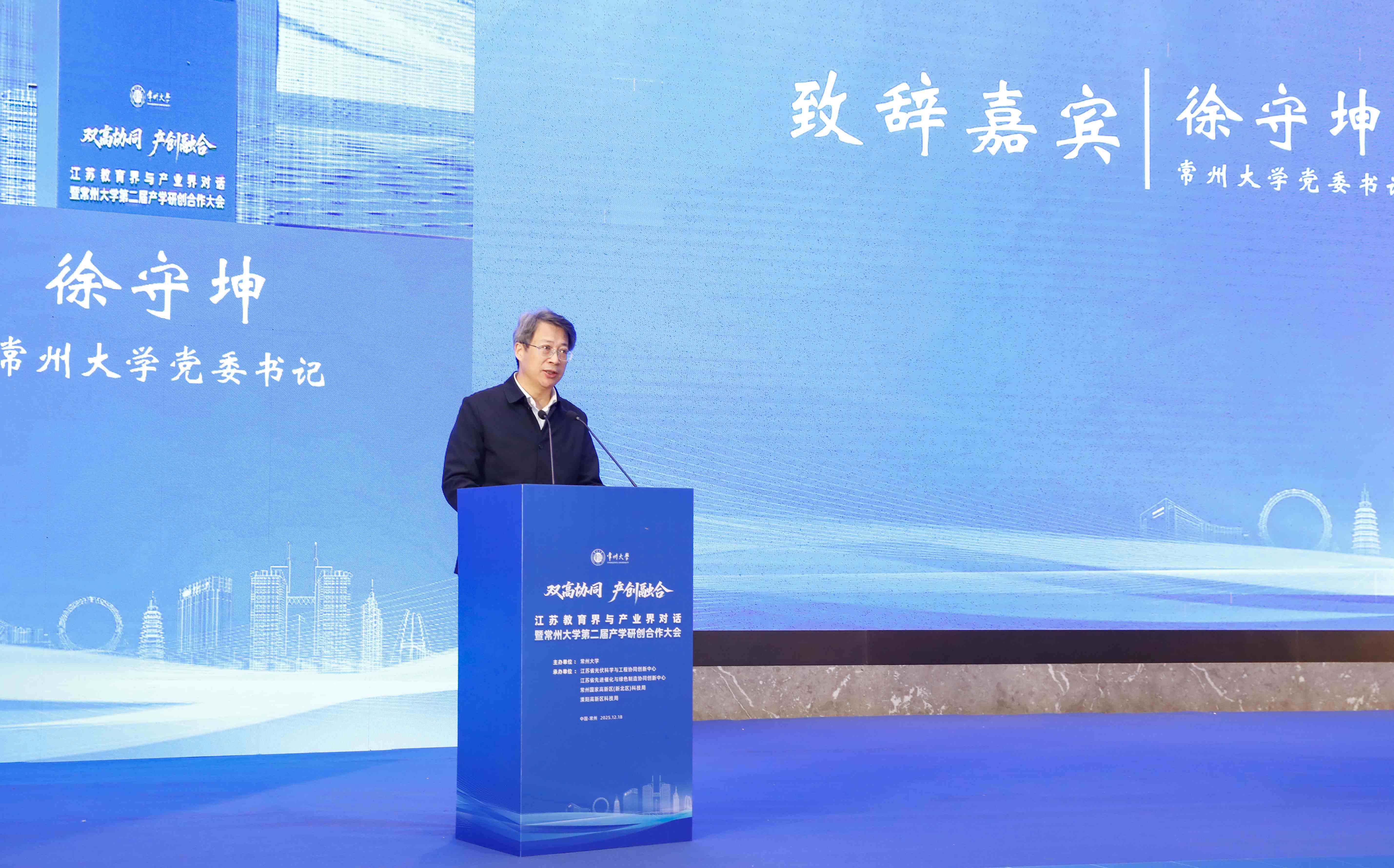 12月18日上午,以“雙高協(xié)同·產(chǎn)創(chuàng)融合”為主題的江蘇教育界與產(chǎn)業(yè)界對(duì)話暨常州大學(xué)第二屆產(chǎn)學(xué)研創(chuàng)合作大會(huì)在常州舉行。常州市委常委、副市長方靖,常州市科學(xué)技術(shù)協(xié)會(huì)主席任洪興,中石油藍(lán)海新材料(通州灣)有限公司副總經(jīng)理勞國瑞,中國石化揚(yáng)子石油化工有限公司副總經(jīng)理曹云波,中石化南京化工研究院有限公司副總經(jīng)理江洋洋,中國石化金陵分公司副總經(jīng)理姜來,中國石化儀征化纖股份有限公司副總經(jīng)理陳志明,中國石化集團(tuán)南京工程有限公司高級(jí)專家謝東升,常州大學(xué)黨委書記徐守坤,黨委副書記、校長陳海群,黨委常委、副校長李亞飛,副校長晏成林出席會(huì)議。來自政府部門、產(chǎn)業(yè)園區(qū)、合作企業(yè)的200余名代表參加會(huì)議。晏成林主持會(huì)議。