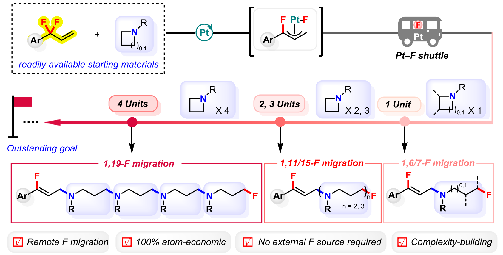 由于氟元素在材料和醫(yī)藥等領(lǐng)域的獨特地位,在分子中精準(zhǔn)引入氟原子一直是有機合成領(lǐng)域長期存在的挑戰(zhàn)。碳氟鍵重組反應(yīng)作為一類新興的氟遷移策略,近年來逐漸受到關(guān)注。然而,現(xiàn)有方法通常局限于原子數(shù)≤4的單單元插入,僅能實現(xiàn)短程氟遷移。近期,常州大學(xué)陳銘教授團(tuán)隊發(fā)展了一種全新的鉑催化策略,利用簡單易得的偕二氟亞甲基烯烴作為含氟前體,通過模塊化的多單元插入反應(yīng),首次實現(xiàn)了超遠(yuǎn)程氟遷移,成功構(gòu)建出一系列1,6-、1,7-、1,11-、1,15-乃至1,19-二氟化合物。這項研究將氟原子的遷移距離前所未有地拓展至19個化學(xué)鍵,開辟了C–F鍵重構(gòu)與空間編輯的新路徑。機理研究表明,反應(yīng)過程中關(guān)鍵在于“Pt–F穿梭”機制:通過連續(xù)的親核插入與配體交換,Pt–F中間體以高度區(qū)域選擇性和優(yōu)異的原子經(jīng)濟(jì)性精準(zhǔn)遞送氟原子。進(jìn)一步研究發(fā)現(xiàn),氟遷移的距離可通過調(diào)節(jié)底物當(dāng)量實現(xiàn)編程式控制;而所形成的C–F鍵則由金屬結(jié)合的Pt–F物種選擇性介導(dǎo),并非由游離的F?參與。這一發(fā)現(xiàn)為遠(yuǎn)程C–F鍵編輯提供了嶄新的催化策略平臺,在藥物分子設(shè)計、含氟材料開發(fā)和有機分子工程等領(lǐng)域具有廣泛的應(yīng)用前景。本研究由陳銘教授指導(dǎo),2023級碩士研